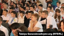 Не стала исключением из этого ряда и Симферопольская украинская гимназия, в которой нынешний выпуск можно считать юбилейным – он 15-й по счету. Родители помнят, что ранее такие собрания, даже не юбилейные, всегда проводились с искренними чувствами и душой. Но сегодня на школьном дворе, который ранее, как правило, был празднично украшен, нет никаких признаков праздника – ни флагов, ни транспарантов, ни лозунгов, ни приветствий гостям. Изменился и сам внешний вид учеников и родителей – только самые убежденные решились надеть вышиванки, совершенно нет символики Украины – ни флагов, ни украшений в украинских цветах. На учениках одежда без национальных признаков, у одного класса синие, у другого красные ленты через плечо.