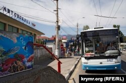 На противоположной стороне трассы на остановке в сторону Симферополя все же собралась небольшая толпа жаждущих уехать. Но первый же подошедший троллейбус забрал всех, так что маршрутке приходится ждать пассажиров.