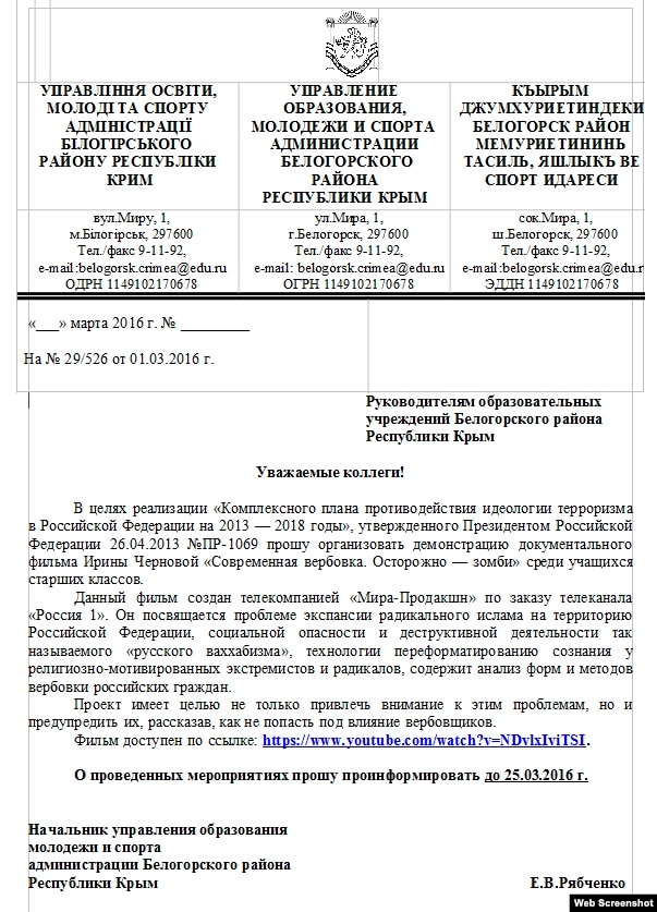 Демонстрация фильма пройдет в рамках реализации «Комплексного плана противодействия идеологии терроризма в Российской Федерации на 2013-2018 годы», утвержденного президентом России 26.04.2013 №ПР-1069 сообщается в письмах, разосланных чиновниками российского министерства образования Крыма по школам полуострова.