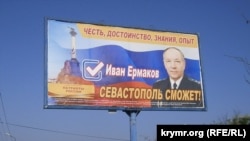 Именно на богатом опыте и офицерском звании акцентирует внимание реклама Ермакова. Основной слоган «Севастополь сможет!» на одном из бигбордов подкреплен характеристикой кандидата – «Честь, достоинство, знания, опыт», на другом плакате красуется ни к чему не обязывающий лозунг «Сделаем жизнь комфортной!».