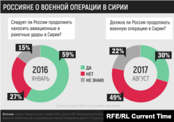 – Нет, о потерях люди очень мало знают, поскольку о них практически ничего не сообщается по федеральному телевидению, а это главные каналы информирования. Люди не понимают самого смысла, зачем нужно было лезть туда. Это далеко от России, и те версии, которые предлагают Кремль и официальная пропаганда, выглядят для массового зрителя не слишком убедительными. Борьба с терроризмом – это не очень понятно, потому что где Сирия, и где Россия? Отстаивание каких-то интересов российских компаний – это по частоте второй вариант ответа, который давали россияне для объяснения этого, это слишком абстрактно и не касается их повседневных жизненных проблем. Из общего контекста выстраивается линия конфронтации с США. И это людей действительно беспокоит очень серьезно, поскольку они понимают, что Россия вошла в клинч, в очень глубокую и длительную конфронтацию с Западом, которая может окончиться и Третьей мировой войной. Сейчас немножко страх перед этим ослаб, но он никуда не ушел, просто интенсивность этого снизилась, но страх сидит глубоко, люди этого боятся. Поэтому Сирия здесь в ряду тех конфликтов, в которые оказалась втянута Россия по воле ее руководства.