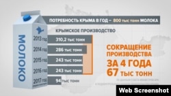 Но крымской продукции на всех не хватает. За год жители и гости полуострова потребляют более 800 тысяч тонн молока. Но в самом Крыму производится только треть необходимого объема. К тому же за время аннексии полуострова собственное производство существенно уменьшилось.
