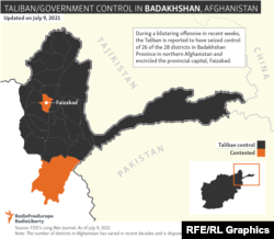 Местные власти в Бадахшане сообщили Таджикской редакции Азаттыка, что 26 из 28 районов северной провинции пали под натиском талибов. Официальные лица Таджикистана заявили, что силы «Талибана» сейчас контролируют 900 километров из 1357-километровой границы с Таджикистаном.