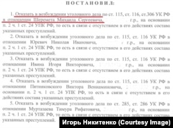 Постановление об отказе в возбуждении уголовного дела подписано следователем Джанкойского следственного отдела Следкома России Ильшатом Халиковым. В документе, копией которого располагают Крым.Реалии, говорится, что Михаил Шеремет заявил о публичном оскорблении, угрозах убийством и причинении тяжкого вреда его здоровью. Правда, как именно пострадало его здоровье, не известно до сих пор, поскольку депутат, в отличие от Игоря Никитенко, не обнародовал никаких медицинских справок или других доказательств.