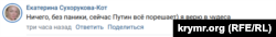 «Ничего, без паники, сейчас Путин всё порешает) я верю в чудеса», – ерничает Екатерина Сухорукова-Кот.