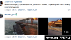Ему вторит Анастасия Русакова: «Не пишите бред, Аршинцево не далеко от маяка, службы работают, пожар почти потушили». В ответ ей Илья Бадия публикует фото и видео горящих цистерн и разрушенных пролетов моста.