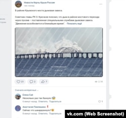 По словам очевидцев, мост через Керченский пролив окутали клубы дыма, фото и видео начали публиковать в соцсетях. Советник Аксенова Олег Крючков, заявил, что на Керченском мосту – «дымовая завеса, поставленная специальными службами».