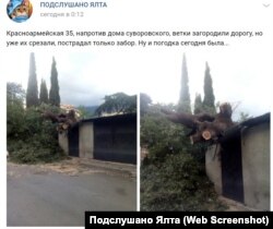 Непогода добралась и до Южного берега Крыма. В Ялте ураганный ветер, бушевавший 4 августа, снес деревья в разных частях города. Фото публикуют очевидцы в группе «Подслушано Ялта» во «ВКонтакте».