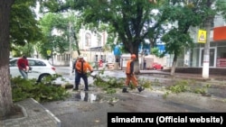 Российские власти Симферополя зафиксировали случаи падения крупных веток и целых деревьев на проезжую часть, а также обрывы электропроводов.