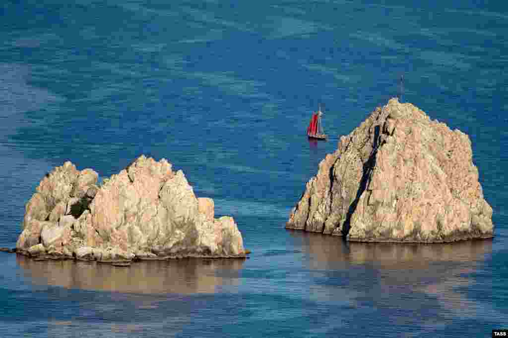 Одна из визитных карточек полуострова – скалы-близнецы Адалары. С крымскотатарского Адалары переводится как «острова». В прошлом Адалары были соединены с побережьем перемычкой. Но постепенно море разрушило ее, и скалы остались островками в паре сотен метров от суши.