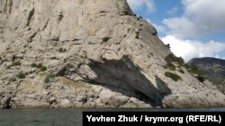 Так выглядит с моря грот Шаляпина или Эстрадный в скалах горы Коба-Кая. Грот князем Голицыным был благоустроен, расширен, а в глубине оборудован «Эстрадный зал» – из-за прекрасной акустики. Бытует мнение, что там выступал Федор Шаляпин, однако достоверных документальных данных об этом нет. Впрочем, в Крыму обо многом нет достоверных сведений, зато легенд хоть отбавляй.