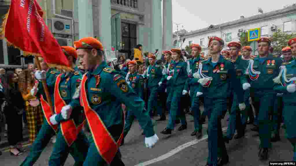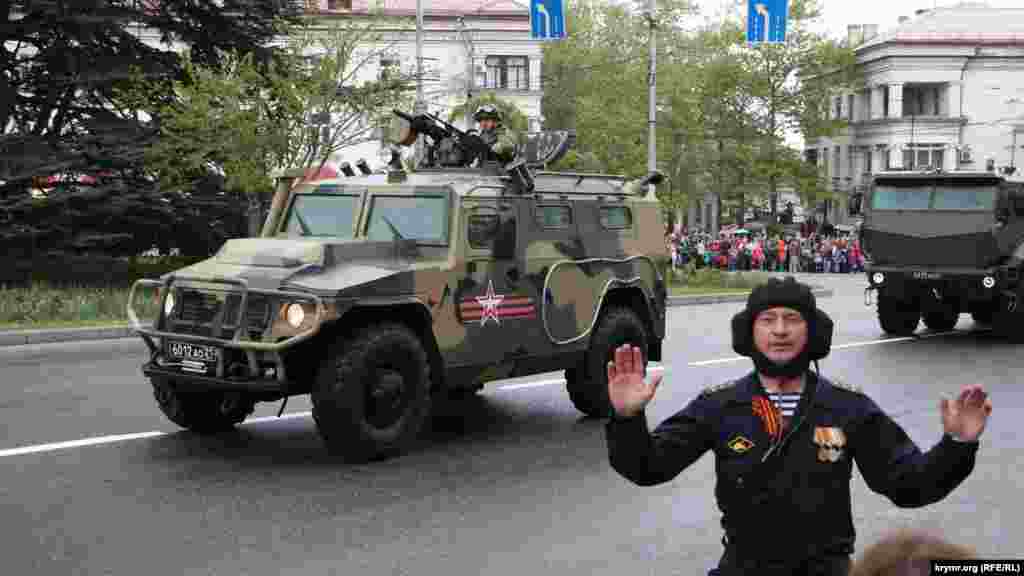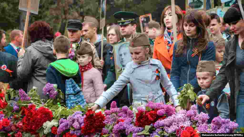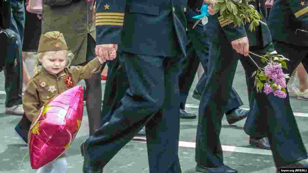 Военная техника, дети, одетые в стилизованную армейскую форму, шествие «Бессмертного полка». В крупных городах Крыма 9 мая отмечают советский и российский праздник День победы.