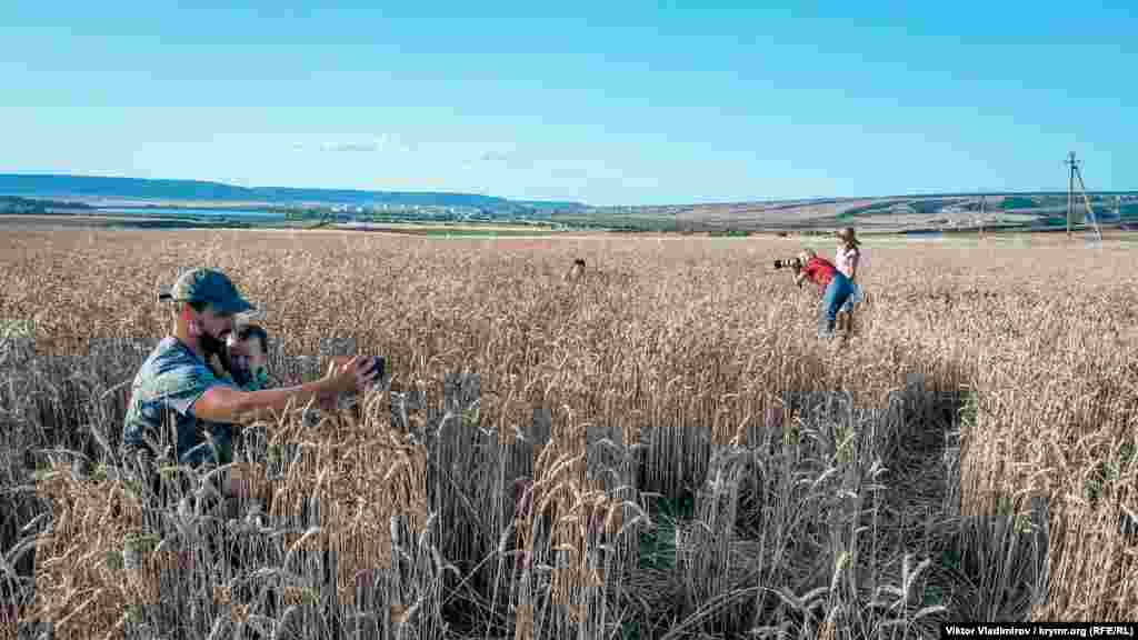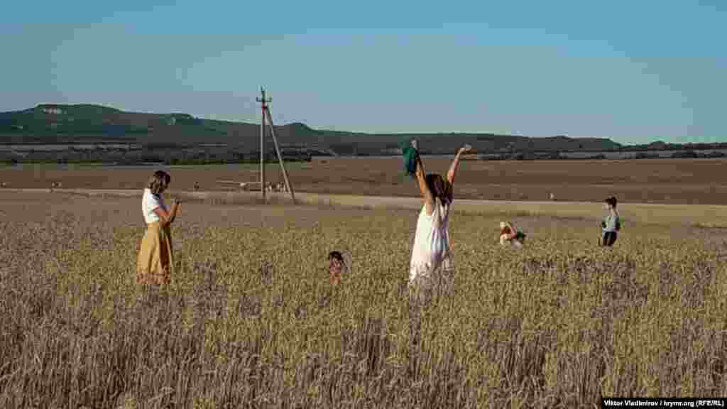 В селе Тургеневка Бахчисарайского района Крыма неподалеку от живописного лавандового поля, раскинулось желто-коричевое поле пшеницы. Здесь созревание зерна только началось. И пока поле не окружили селяне с косилками, сюда приезжают отдыхающие и местные, чтобы сделать фотографии.