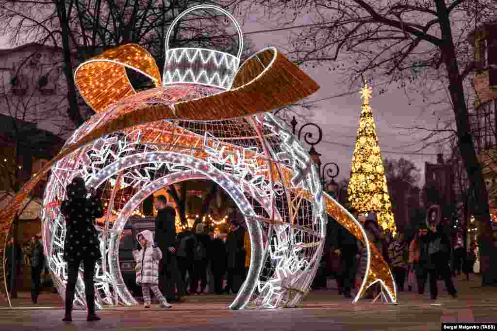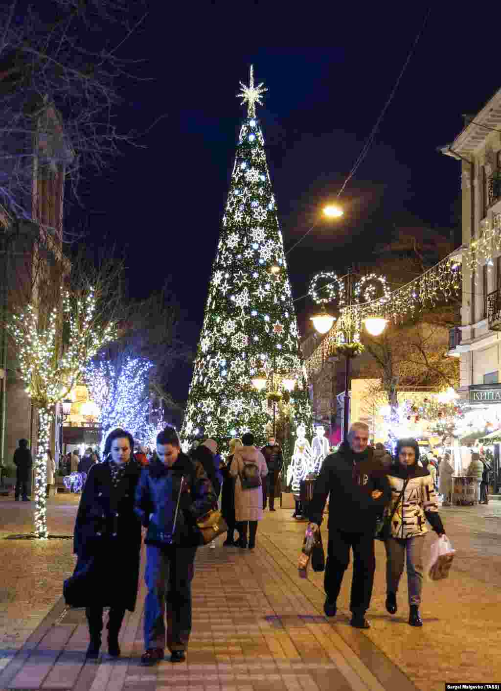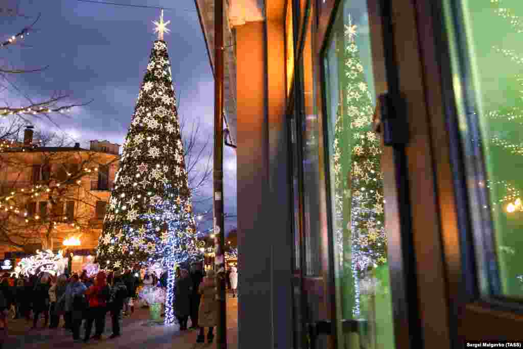 В центре Симферополя уже стоит «главная» новогодняя елка, а улицы сияют огнями новогодней иллюминации. Однако в этом году елка стоит не на площади Ленина, как раньше, а на пересечении улиц Горького и Пушкина. Это связано с тем, что площадь Ленина до сих пор находится на реконструкции.