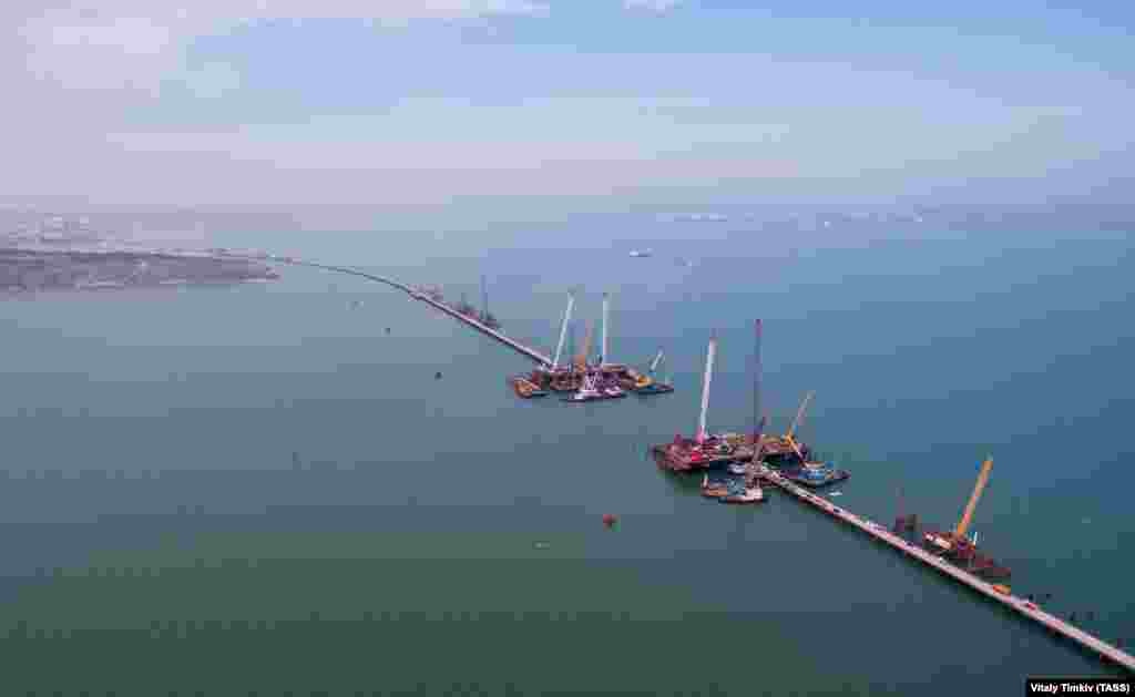 Вид с высоты показывает конец моста со стороны Крыма. Фотограф Станислав Забурдаев, который сделал этот снимок при помощи дрона в июле 2017 года, сказал Радио Свободе, что темпы строительства очевидны: «Я был там и в прошлом году. Впереди еще много работы, долгий путь, но за прошлый год было очень много сделано. Я на самом деле был поражен».