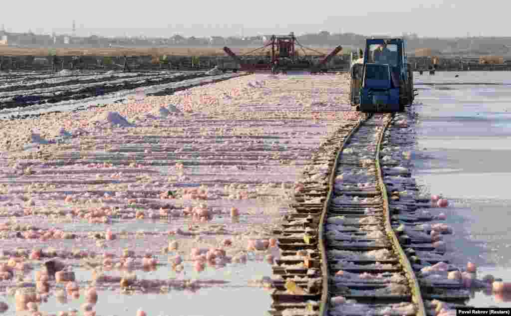 Морская лагуна, известная как озеро Сасык-Сиваш, является источником редкого ресурса – розовой соли. Минерал окрашен крошечными водорослями, которые производят пигмент бета-каротин. Каждую осень сезонные рабочие собирают тысячи тонн розовой соли для переработки и экспорта.
