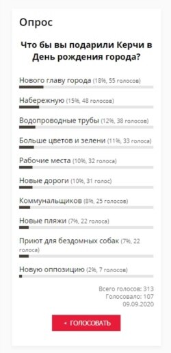 Ответ на проведенный одним из местных сайтов опрос о лучшем подарке ко Дню города, был предсказуем и ожидаем, как летняя жара. Керчане хотели бы видеть не только красивую набережную и отлаженную коммунальную и дорожную инфраструктуру – они жаждут смены местной власти, от председателя горсовета и главы администрации, до депутатского корпуса. Особенно – тех, кто беззастенчиво торгует лицом по каждому поводу.