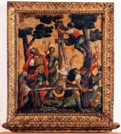Вернемся же к кулону миссис Гейтс. В популярной культуре перевернутый крест часто считают сатанинским символом. В действительности же это крест Святого Петра. Когда его, первого епископа Рима, приговорили к распятию, он потребовал, чтобы его распяли головой вниз, поскольку он считал себя недостойным быть распятым так же, как Иисус. Ниже представлена православная икона с изображением этой сцены: